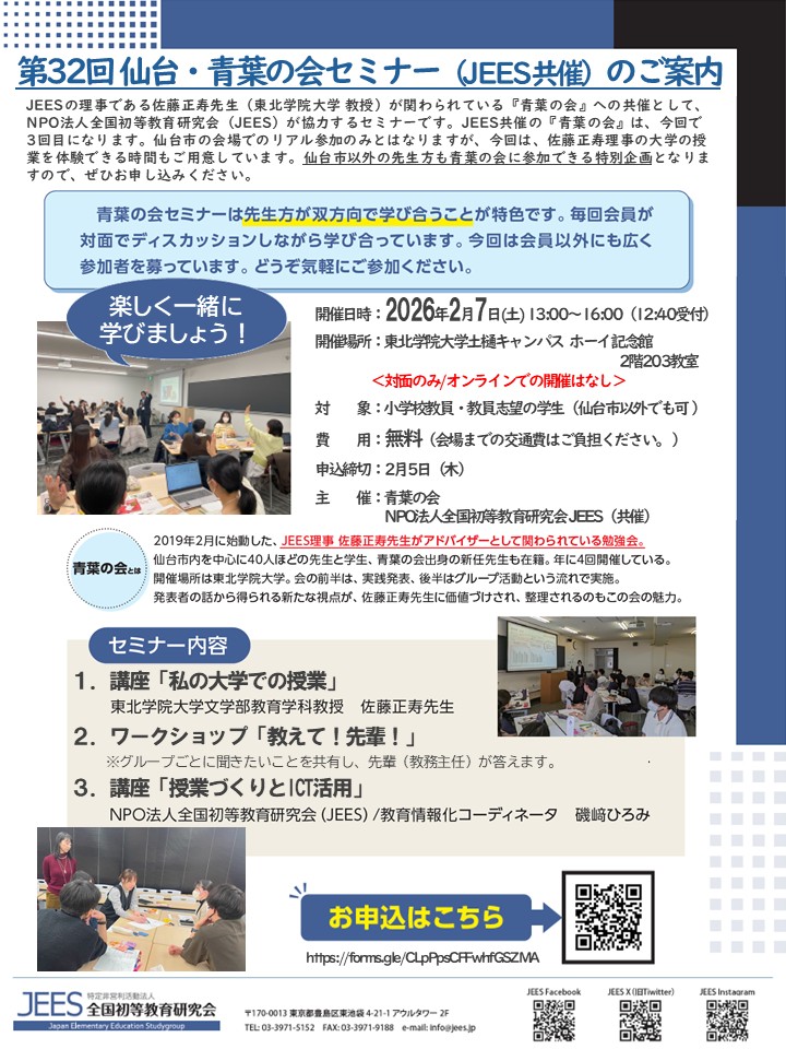 | 概要 | JEESの理事である佐藤正寿先生(東北学院大学 教授)が関わられている『青葉の会』への共催として、NPO法人全国初等教育研究会(JEES)が協力するセミナーです。JEES共催の『青葉の会』は、今回で3回目になります。