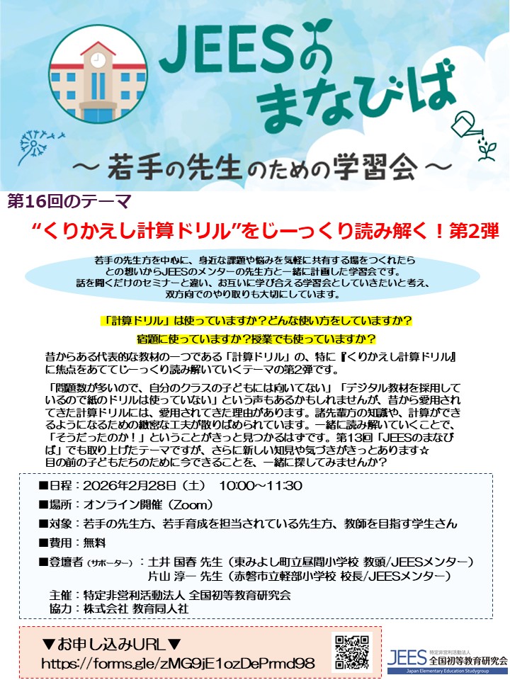 第16回「JEESのまなびば」~若手先生のための学習会~ 「“くりかえし計算ドリル”をじーっくり読み解く!第2弾」
